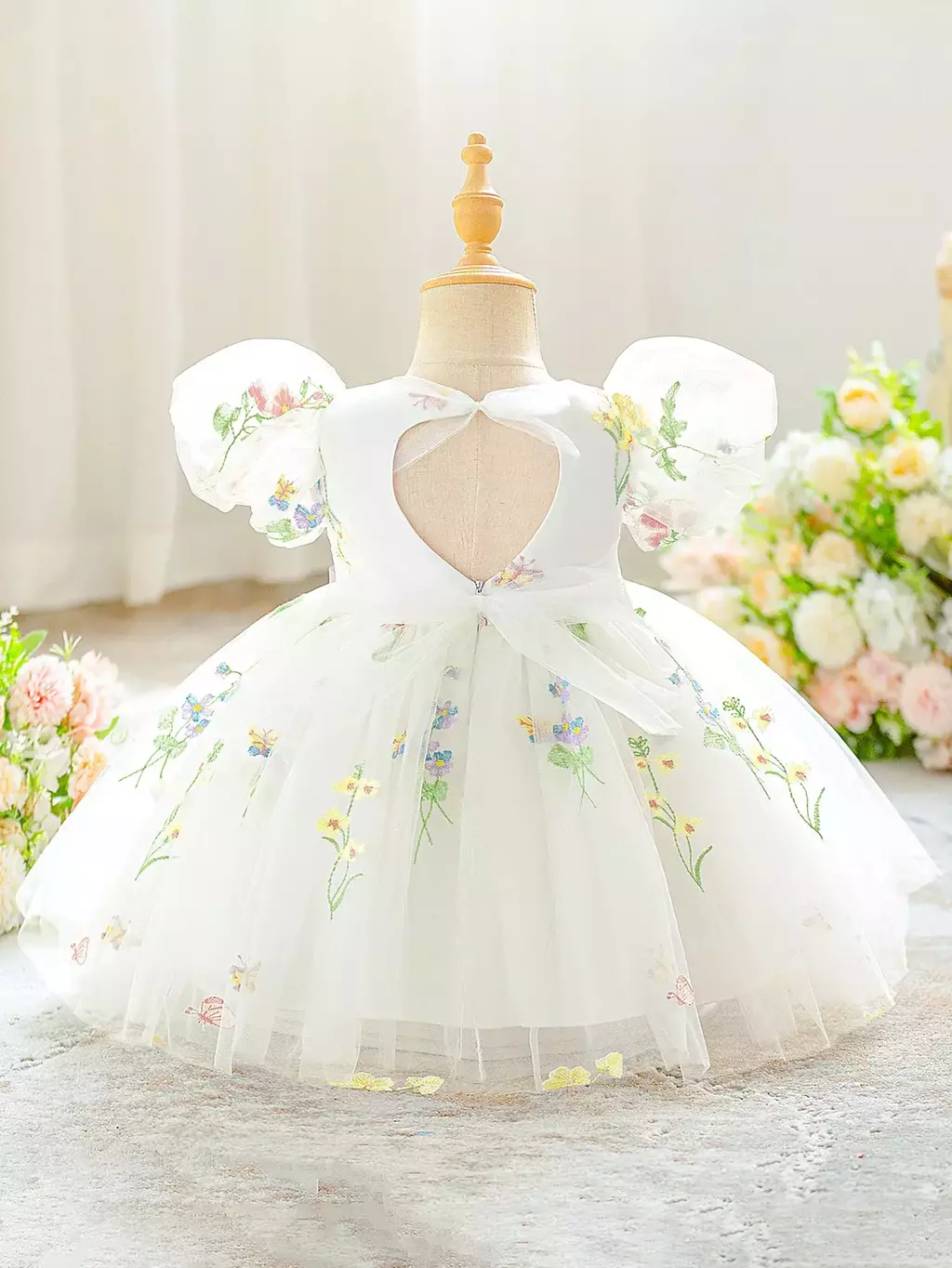 O destaque deste vestido está nos detalhes bordados de flores, que adicionam um toque de charme e delicadeza. Cada flor é cuidadosamente bordada à mão, proporcionando um visual exclusivo e sofisticado. O design encantador deste vestido fará com que sua pequena se sinta como uma verdadeira princesa!
