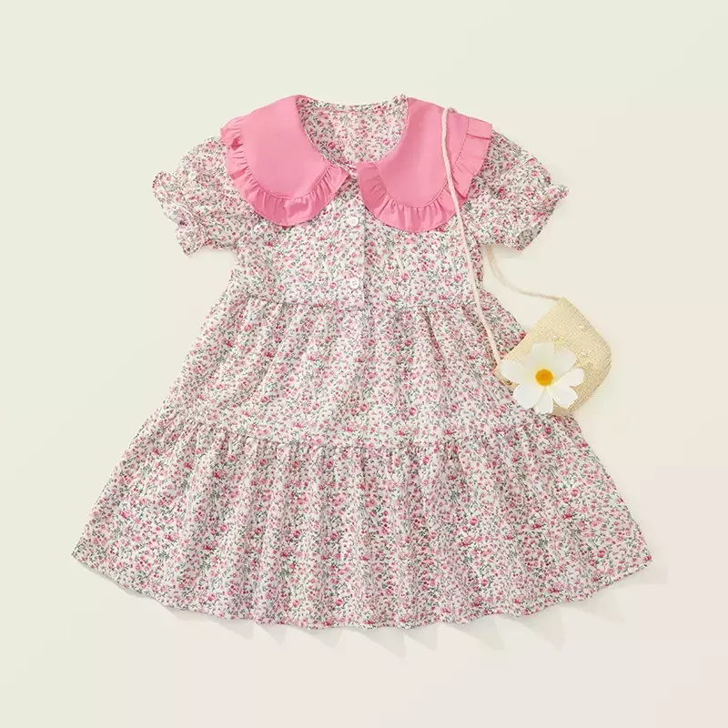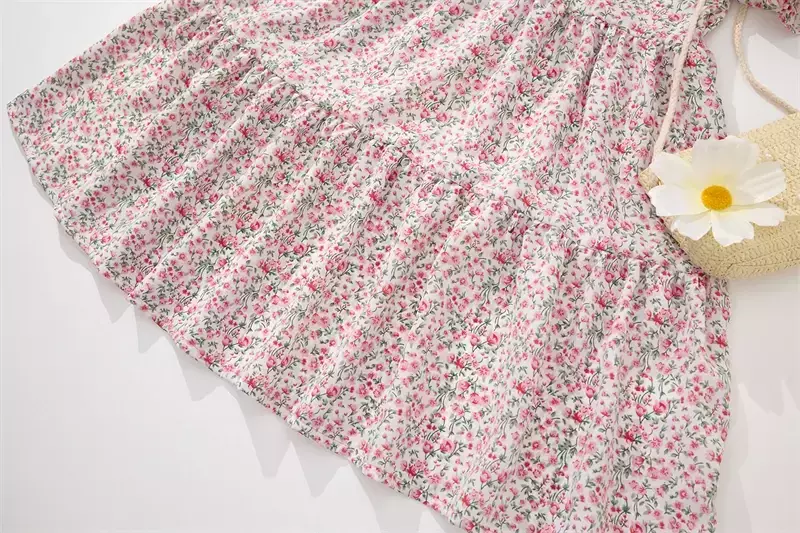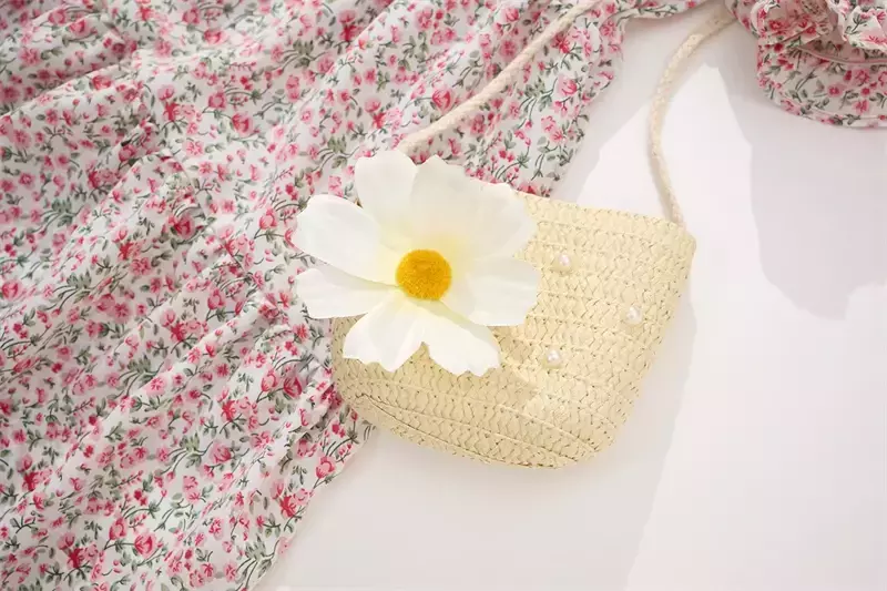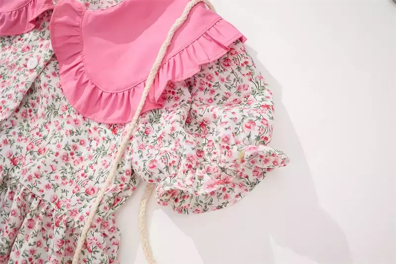 O design floral do vestido é simplesmente encantador, com estampas vibrantes que destacam a beleza e a alegria da infância. Além disso, o conjunto inclui uma bolsa combinando, perfeita para carregar os pequenos tesouros das crianças de forma prática e estilosa.